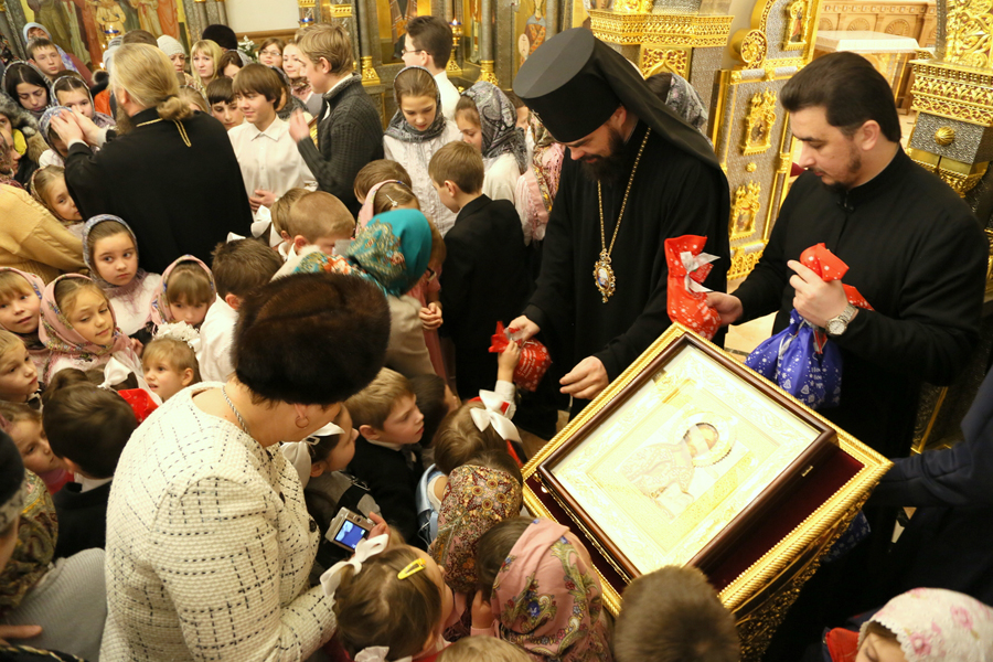 После литургии митрополит Митрофан посетил праздник святого Николая для детей переселенцев, организованный по его благословению Дружковским благочинием совместно с Центром детского и юношеского творчества, где вручил детям подарки.