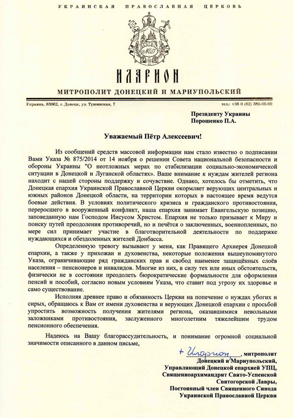 Из сообщений средств массовой информации нам стало известно о подписании Вами Указа № 875/2014 от 14 ноября о решении Совета национальной безопасности и обороны Украины «О неотложных мерах по стабилизации социально-экономической ситуации в Донецкой и Луганской областях». Ваше внимание к нуждам жителей региона находит с нашей стороны поддержку и сочувствие. Однако, хотелось бы отметить, что Донецкая епархия Украинской Православной Церкви окормляет верующих центральных и южных районов Донецкой области, на территории которых в настоящее время ведутся боевые действия. В условиях политического кризиса и гражданского противостояния, переросшего в вооруженный конфликт, наша епархия занимает Евангельскую позицию, заповеданную нам Господом Иисусом Христом. Епархия не только призывает к Миру и поиску путей преодоления противоречий, но и печётся о заключенных, военнопленных, по мере сил принимает участие в благотворительной деятельности по поддержке нуждающихся и обездоленных жителей Донбасса.