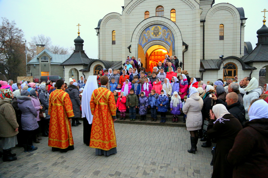 У входа в храм владыку поприветствовали воспитанники воскресной школы «Голубка». Дети исполнили стихи и песнопения, посвящённые преподобному Иову Почаевскому.