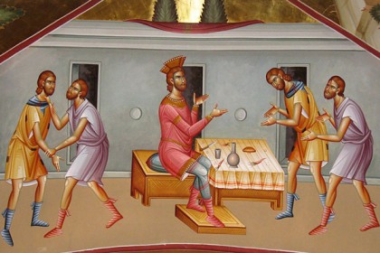Смиловавшись над слугой, царь отпустил его и долг простил ему. А когда слуга вышел, он встретил одного из царских слуг, который должен был ему сто динариев, и, схватив его, стал душить, крича при этом: верни мне то, что задолжал! Тогда слуга этот припал к ногам его и стал умолять его: подожди ещё, и я всё верну тебе. Но тот, не желая ждать, пошёл и заключил его в темницу до тех пор, пока он не вернёт то, что должен. А другие слуги видели всё это и, удручённые происшедшим, пошли и доложили государю своему о случившемся.