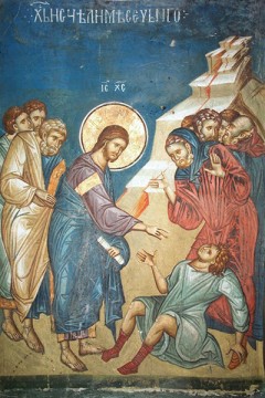Иисус сказал ему: если сколько-нибудь можешь веровать, всё возможно верующему. И тотчас отец отрока воскликнул со слезами: верую, Господи! помоги моему неверию. Иисус, видя, что сбегается народ, запретил духу нечистому, сказав ему: дух немой и глухой! Я повелеваю тебе, выйди из него и впредь не входи в него. И, вскрикнув и сильно сотрясши его, вышел; и он сделался, как мертвый, так что многие говорили, что он умер. Но Иисус, взяв его за руку, поднял его; и он встал.