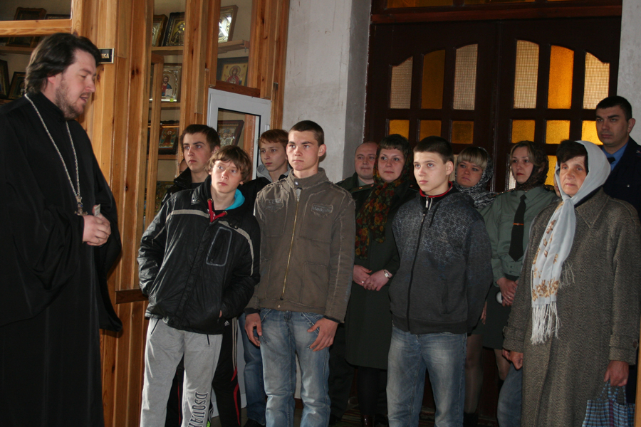 Протоиерей Александр Франтовский встретил подростков и их наставников у входа в храм, подвёл к иконам и к Распятию. Священник побеседовал с ребятами о распятии Христа, о человеческом малодушии и лицемерии, о разбойнике, который, покаявшись на кресте, первым вошёл в рай со Спасителем.