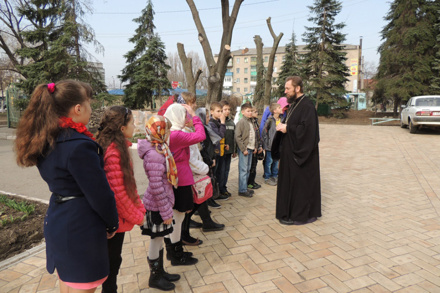 2 апреля в гимназии «Интеллект» г. Дружковки прошел необычный урок. Вместе с преподавателем учащиеся 6 класса посетили с экскурсией старейший храм города — Николаевскую церковь, основанную в 1900 году. Экскурсию для детей провел настоятель храма — благочинный Дружковского округа протоиерей Николай Мельничук. Он рассказал об истории церкви и её архитектурных особенностях, о храме как месте молитвы и встречи с Богом, особенностях устройства православного храма и его символике.