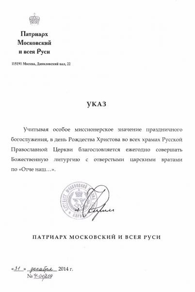 По благословению Святейшего Патриарха Московского и всея Руси Кирилла Божественная литургия в праздник Рождества Христова во всех храмах Церкви в 2015 году и в последующие годы будет проходить с отверстыми Царскими вратами по «Отче наш…» Такой указ был разослан во все епархии Русской Православной Церкви, в том числе в епархии Самоуправляемых Церквей, Белорусского Экзархата, Митрополичьих округов и в епархии Русской Зарубежной Церкви.